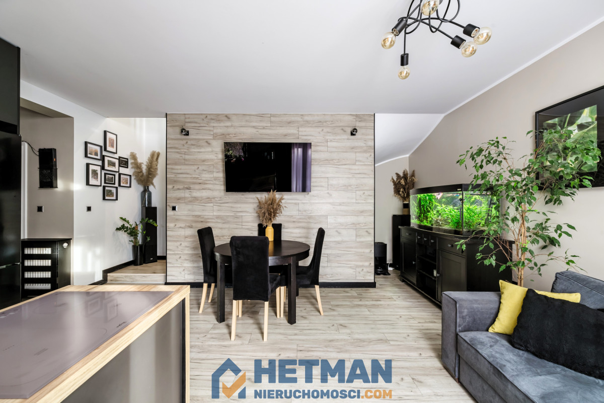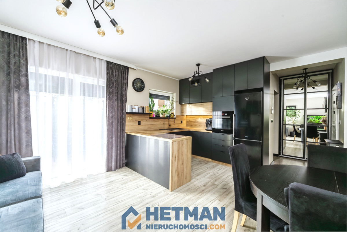 2. kuchnia wraz z salonem (łącznie 24m²) - kuchnia z oknem, dodatkową, doskonałą formą wentylacji, z zabudową wykonaną na zamówienie, wyposażona w pełni w sprzęt agd (zmywarka, piekarnik, płyta indukcyjna, lodówka z zamrażarką), salon z wyjściem na taras i ogród;
