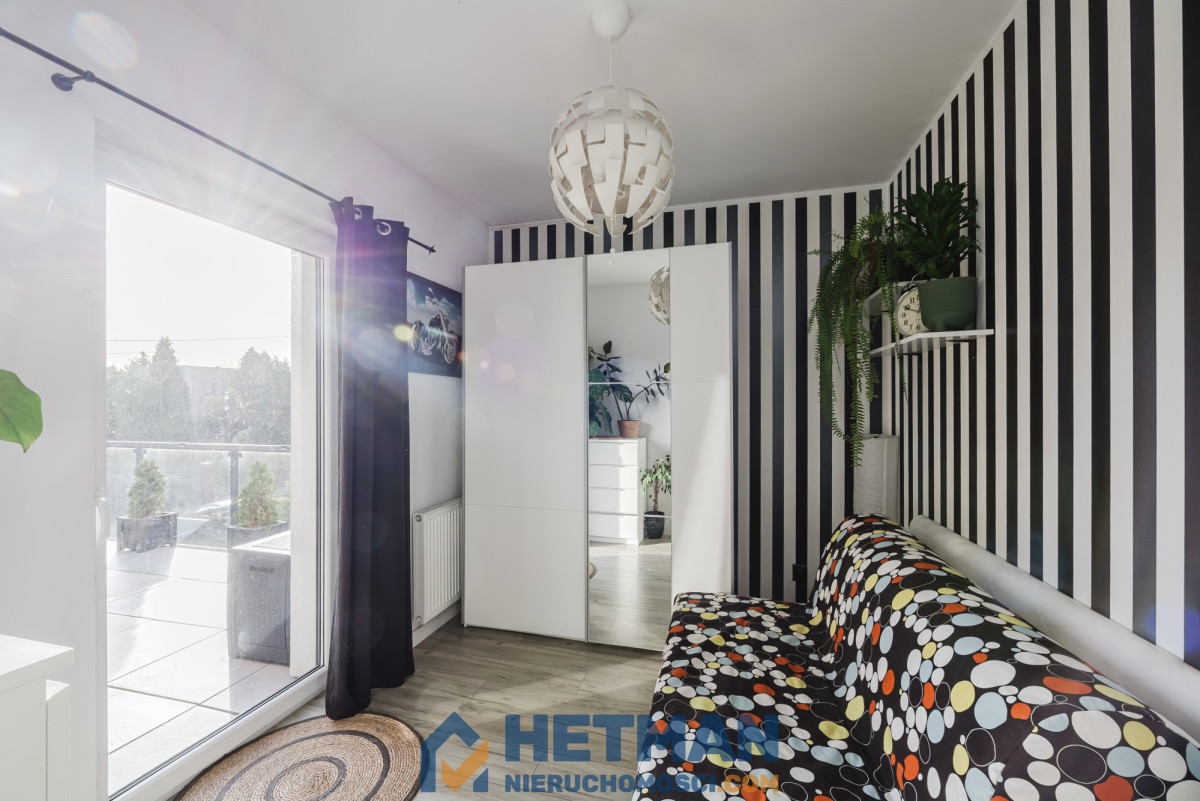 3. druga sypialnia (8,44m²) - również z wyjściem na taras, obecnie wykorzystywana jako pokój gościnny, doskonale sprawdzi się np. jako gabinet lub garderoba z racji sąsiedztwa sypialni;