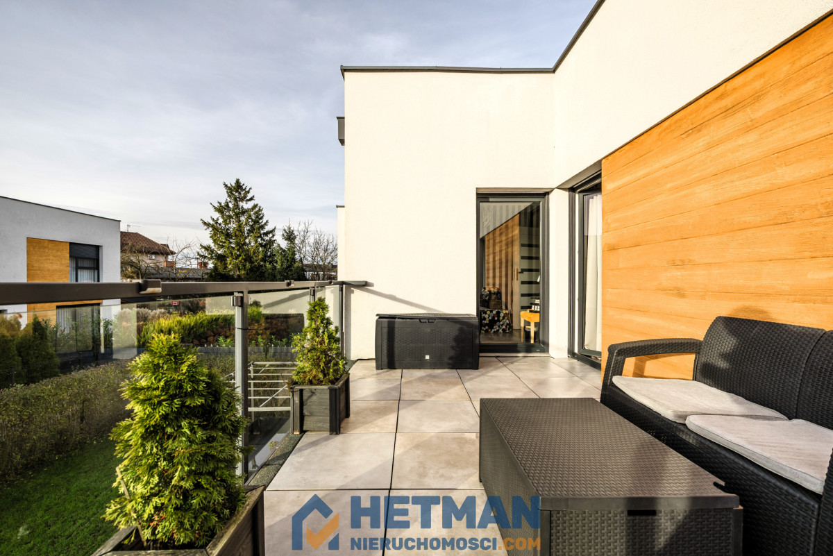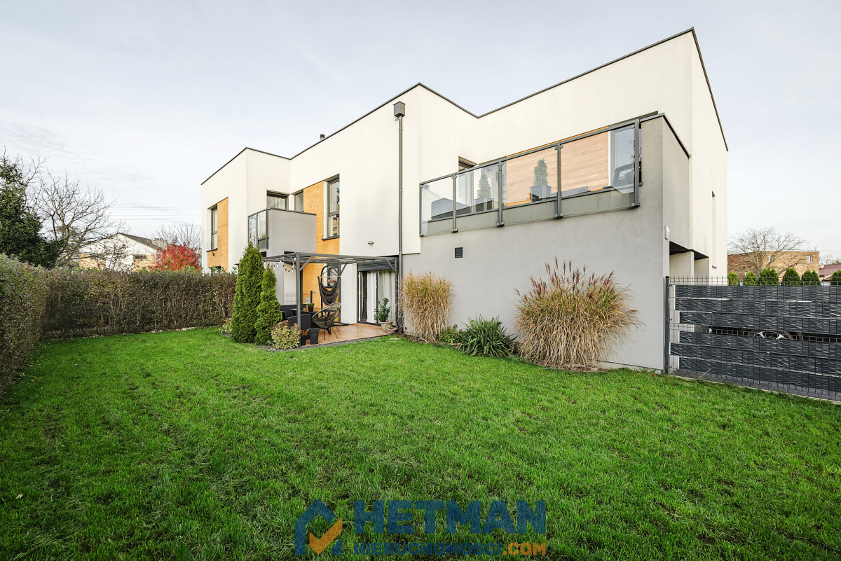 Na nowych właścicieli czeka ciekawa bryła z aż dwoma tarasami - jeden na piętrze i drugi na parterze z wyjściem do zadbanego i doskonale zagospodarowanego ogrodu.